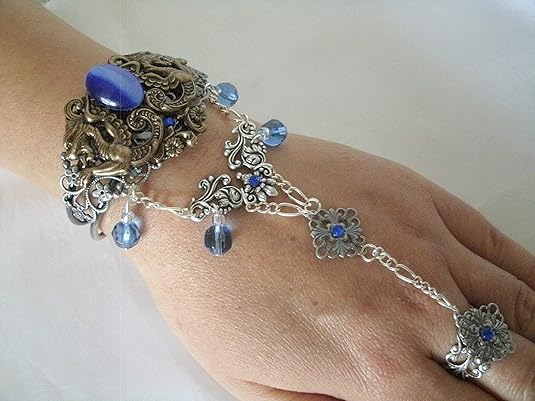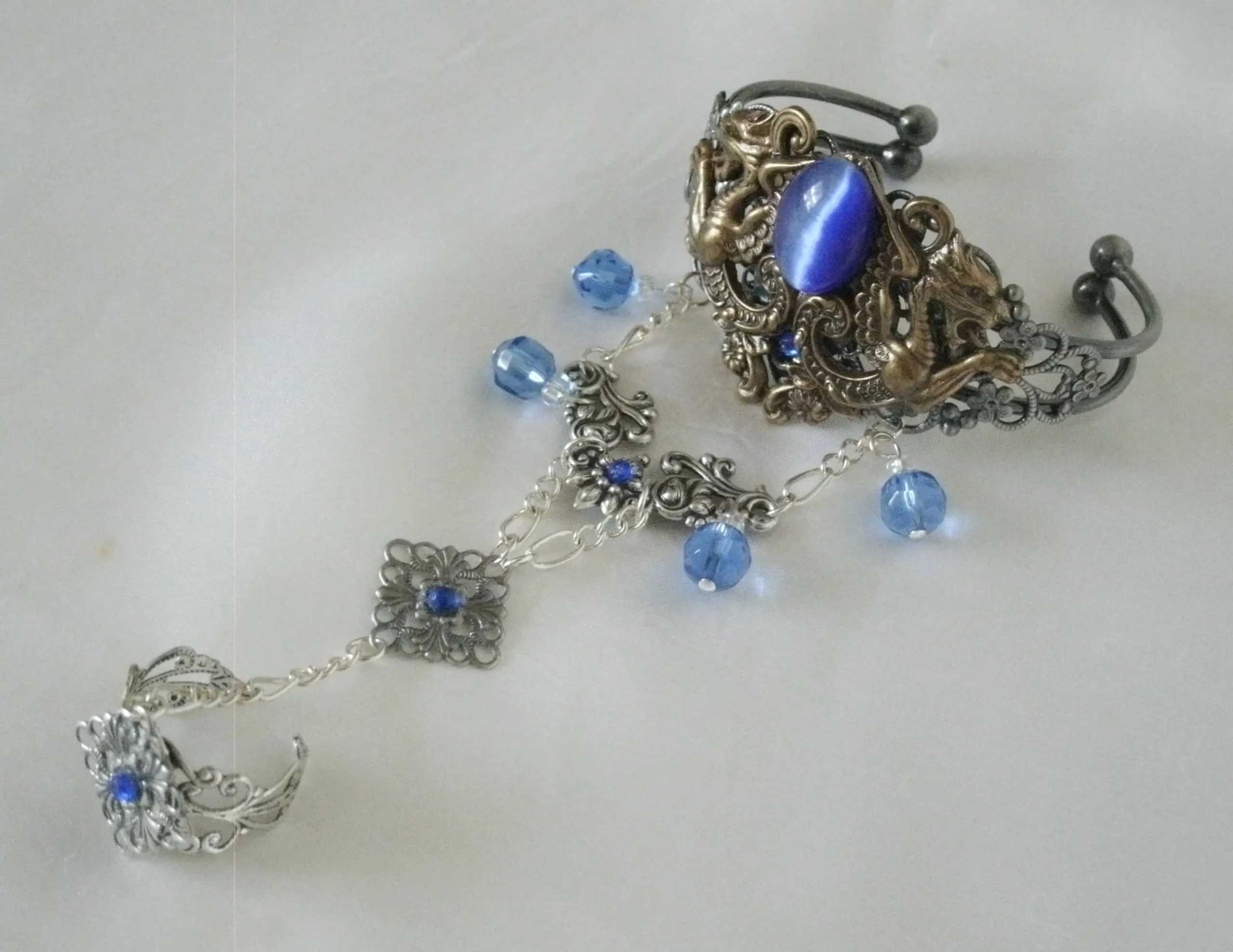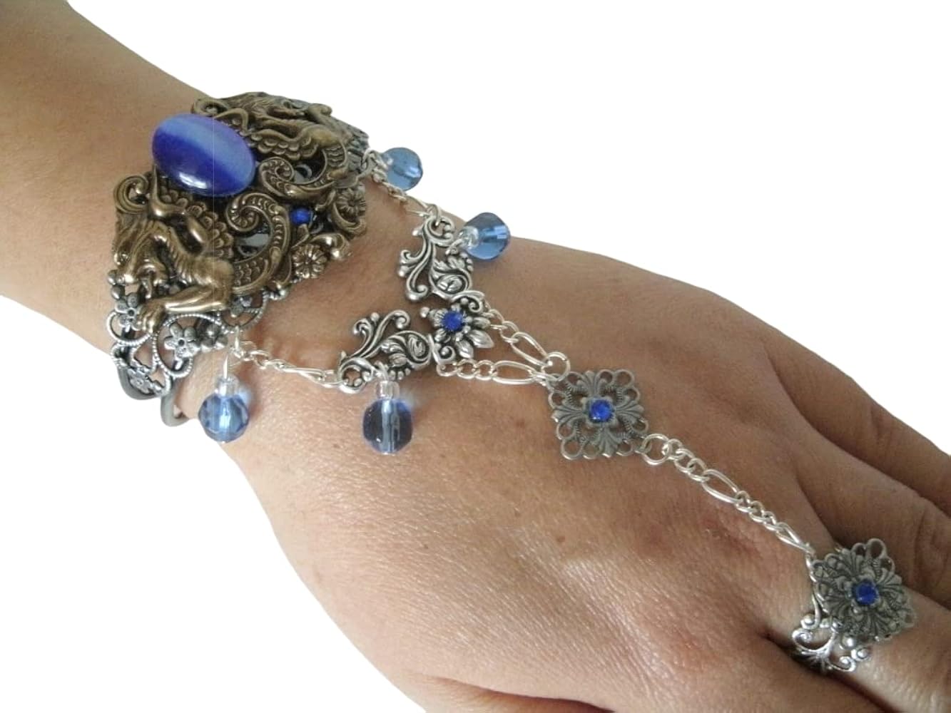 Pulsera–anillo estilo vintage en acabado plateado con piedra azul central y cristales colgantes. Elegante, delicada y perfecta para aportar un toque bohemio y sofisticado a cualquier look especial.